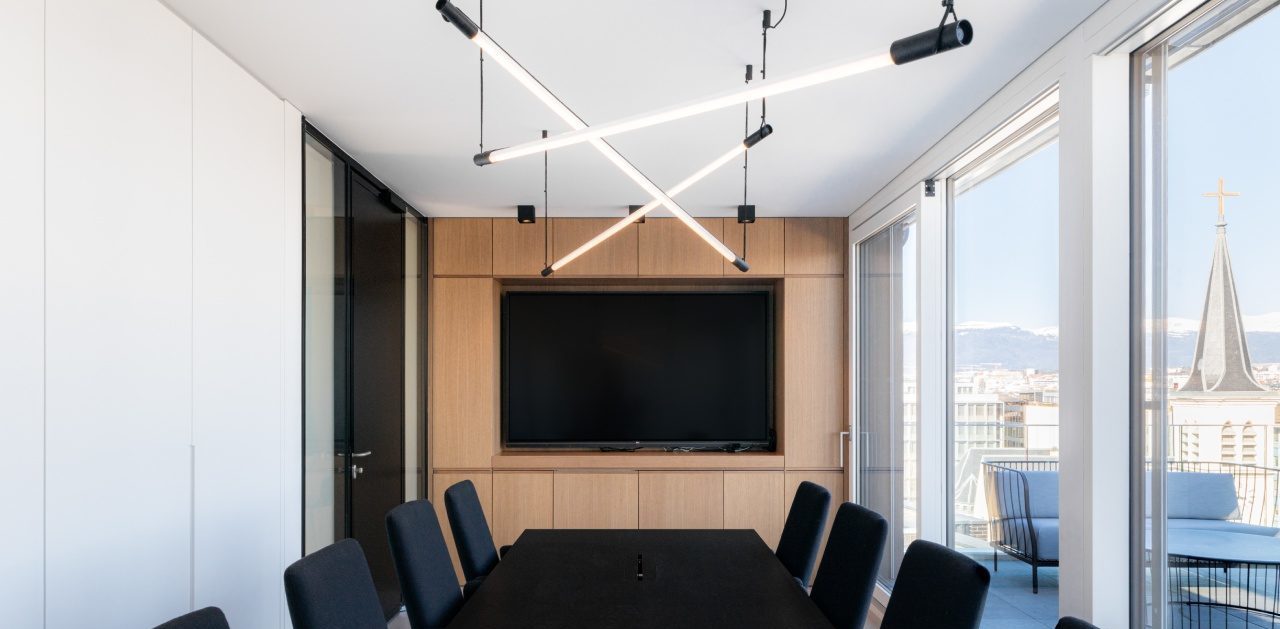 La salle de conférence donnant sur l’immense terrasse offre une vue exceptionnelle sur Genève.