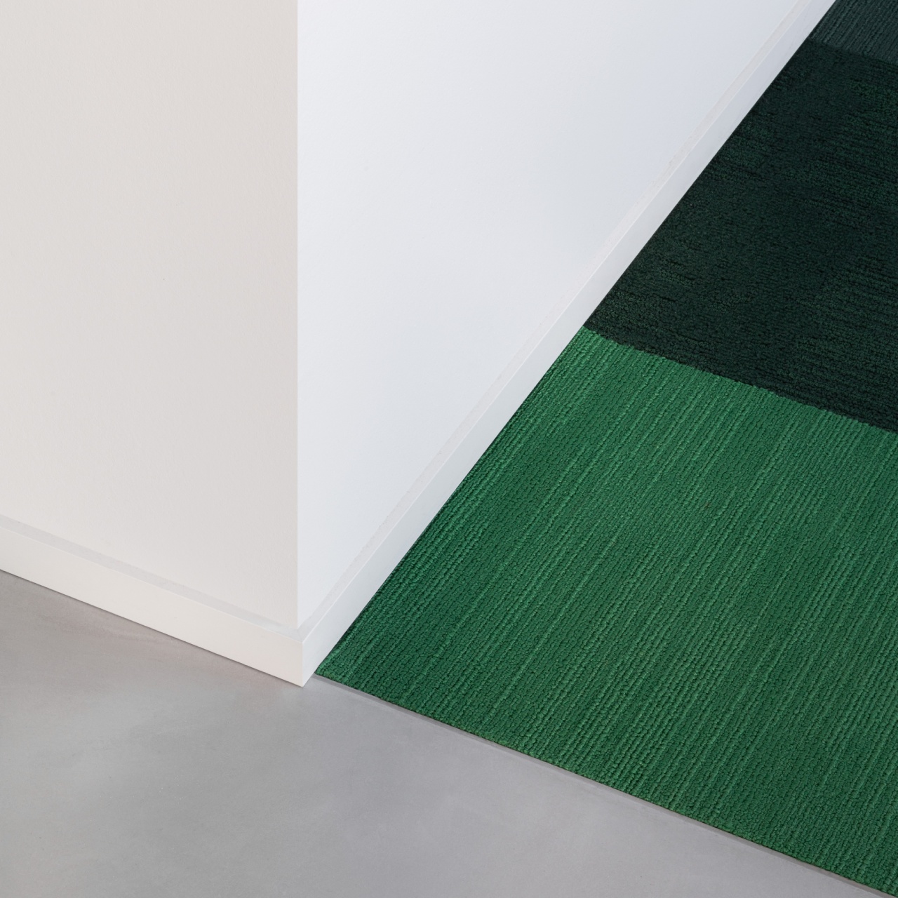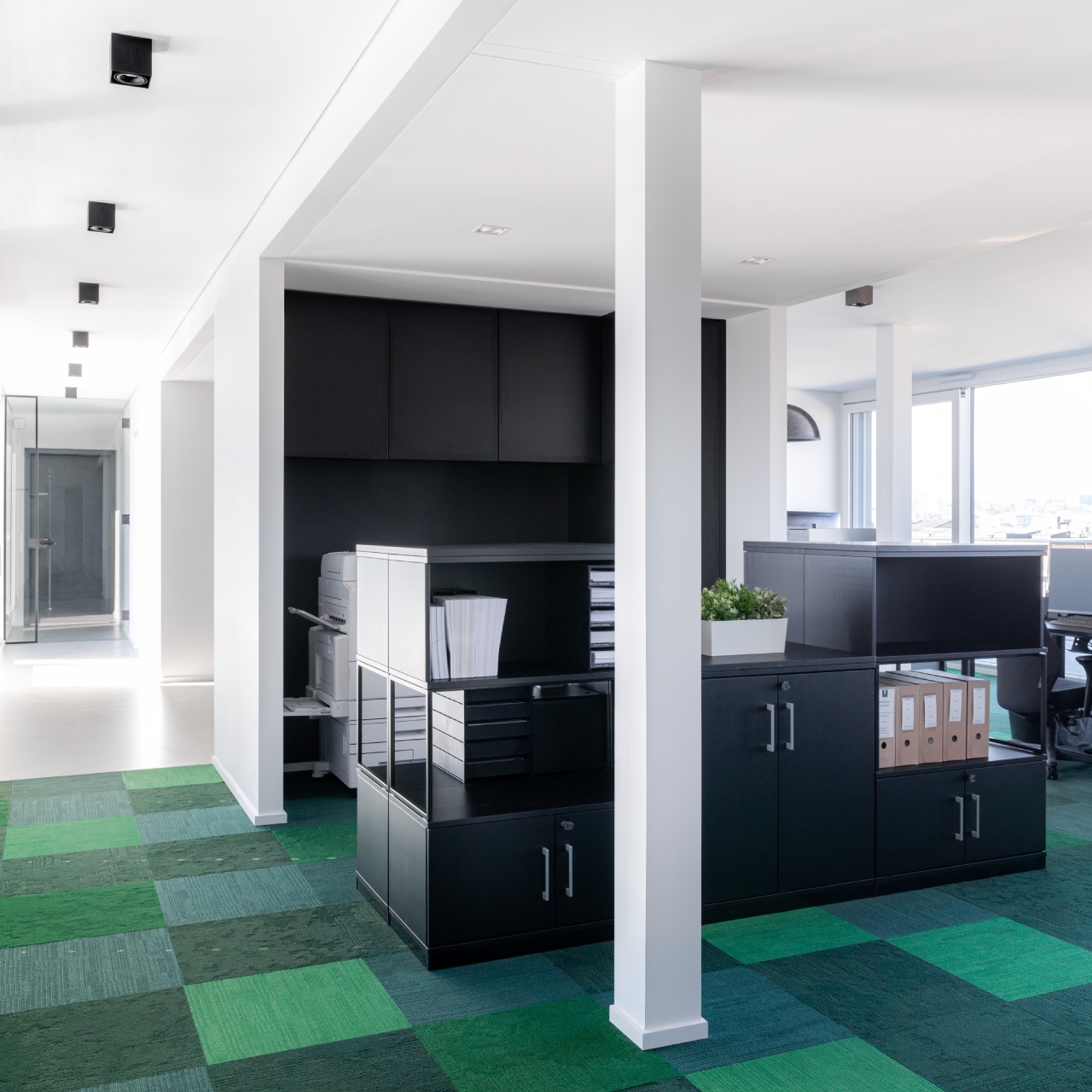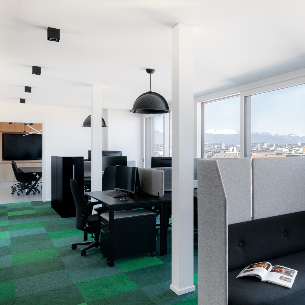 La surface disponible a été repensé afin de recevoir des espaces de bureaux ouverts, dont la matérialité contemporaine des revêtements et des agencements crée une ambiance sobre et élégante, et qui est soutenu par un damier de moquette verte, couleur de l’entreprise.