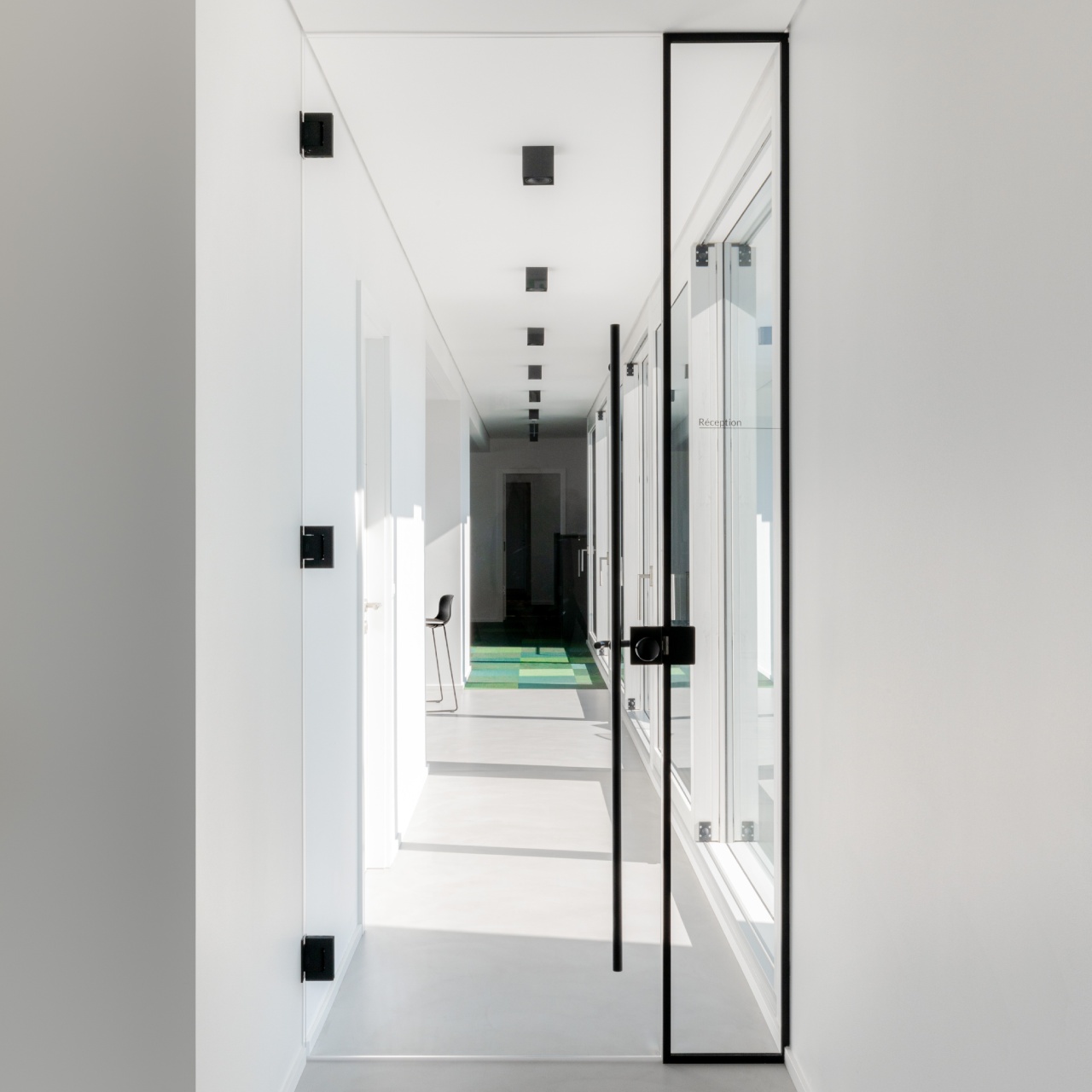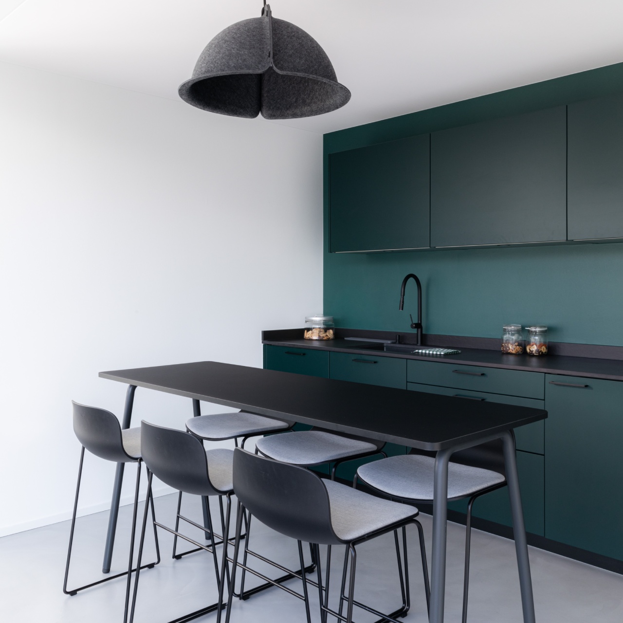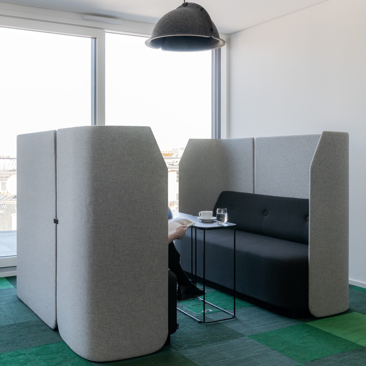 La surface disponible a été repensé afin de recevoir des espaces de bureaux ouverts, dont la matérialité contemporaine des revêtements et des agencements crée une ambiance sobre et élégante, et qui est soutenu par un damier de moquette verte, couleur de l’entreprise.