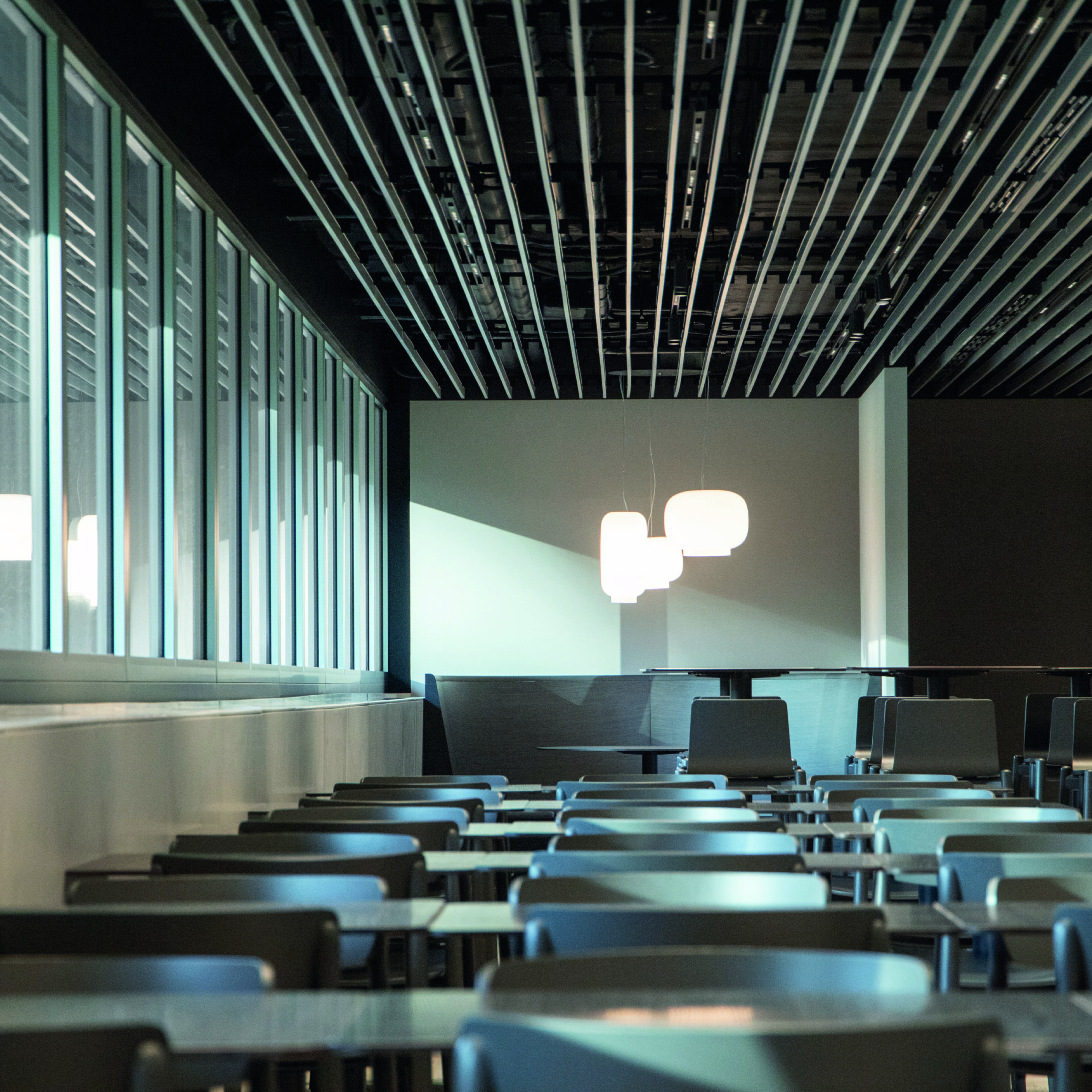 Transformation intérieure de locaux administratifs sur deux étages en centre de conférence et cafétéria.