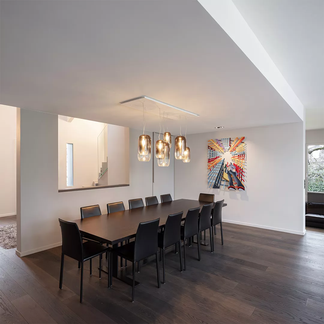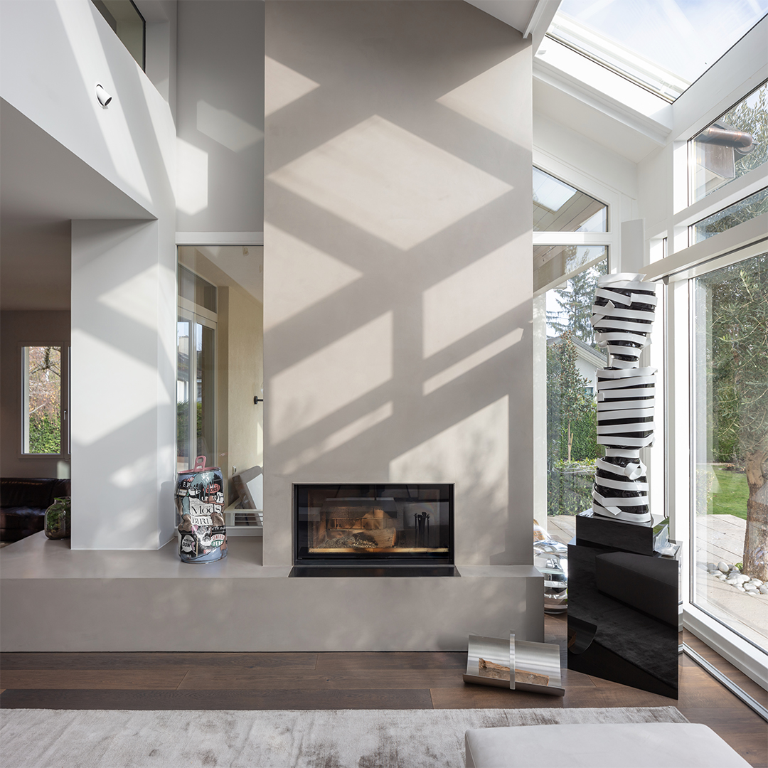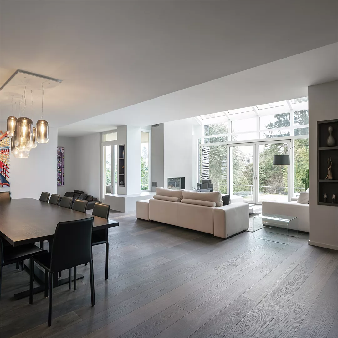 Rénovation conséquente permettant la réalisation d’un seul et grand espace bénéficiant d’une lumière naturelle abondante. Réalisation d’une cheminée dans l’espace véranda et transformation de l’escalier principal.