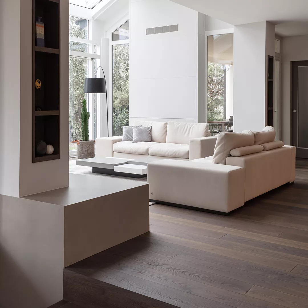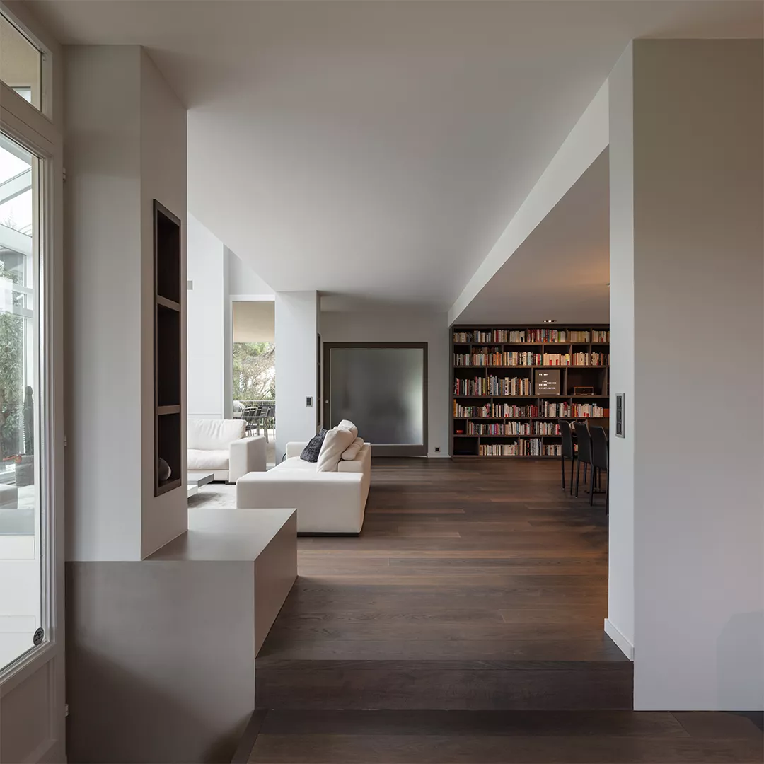 La création d’agencement sur mesure avec des nouveaux matériaux de finition tel qu’un parquet huilé et un béton ciré, crée une ambiance sobre et élégante.