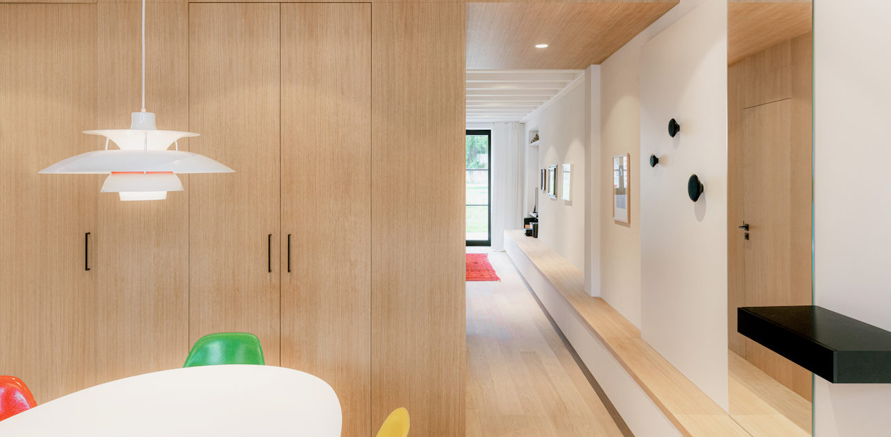Le choix de matière et teinte et l’intégration d’un agencement sur mesure spécifique à contribué à la simplification des espaces pour une ambiance intimiste.