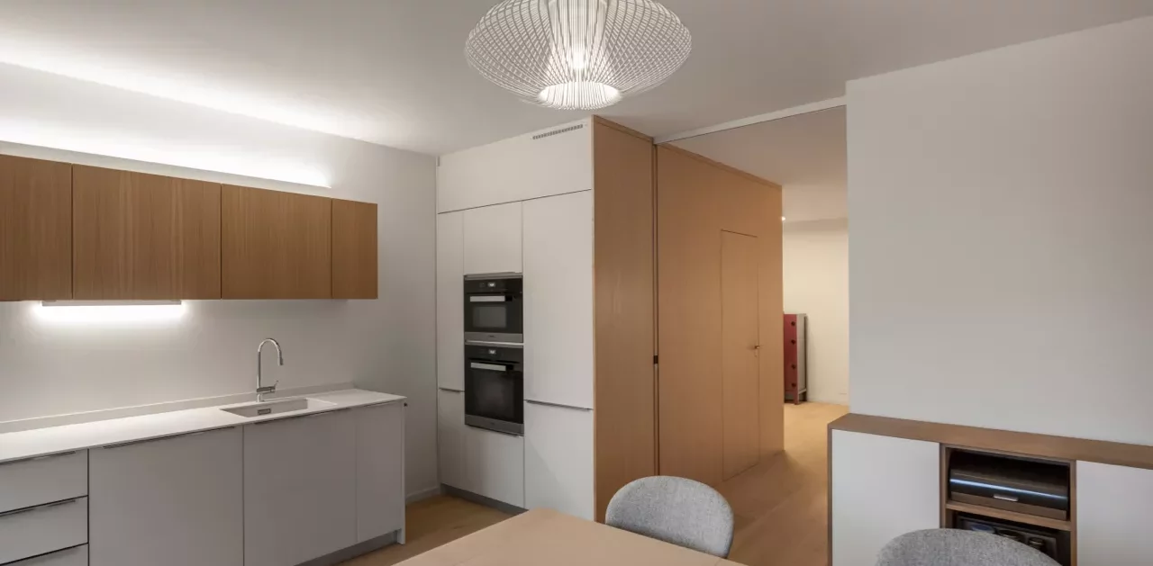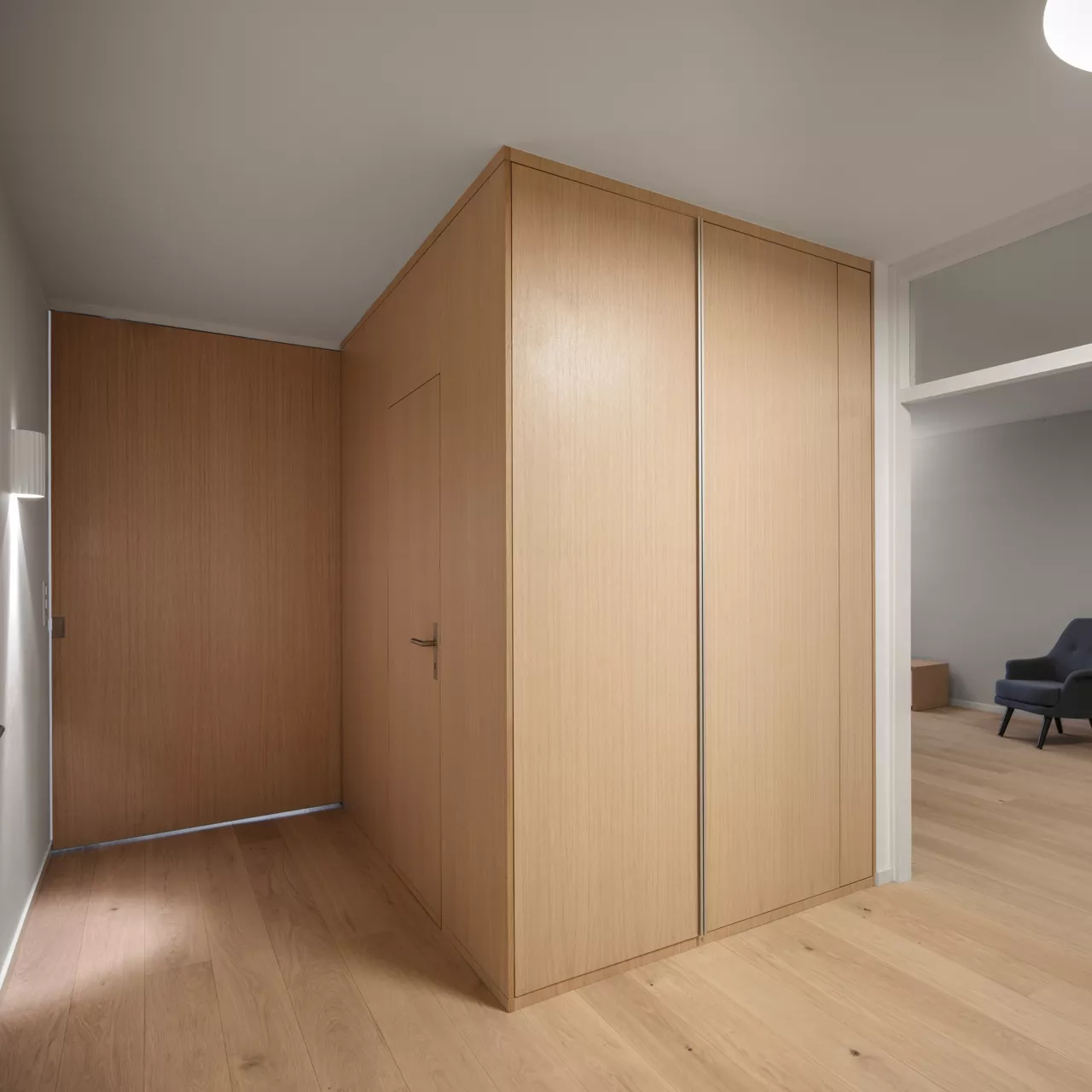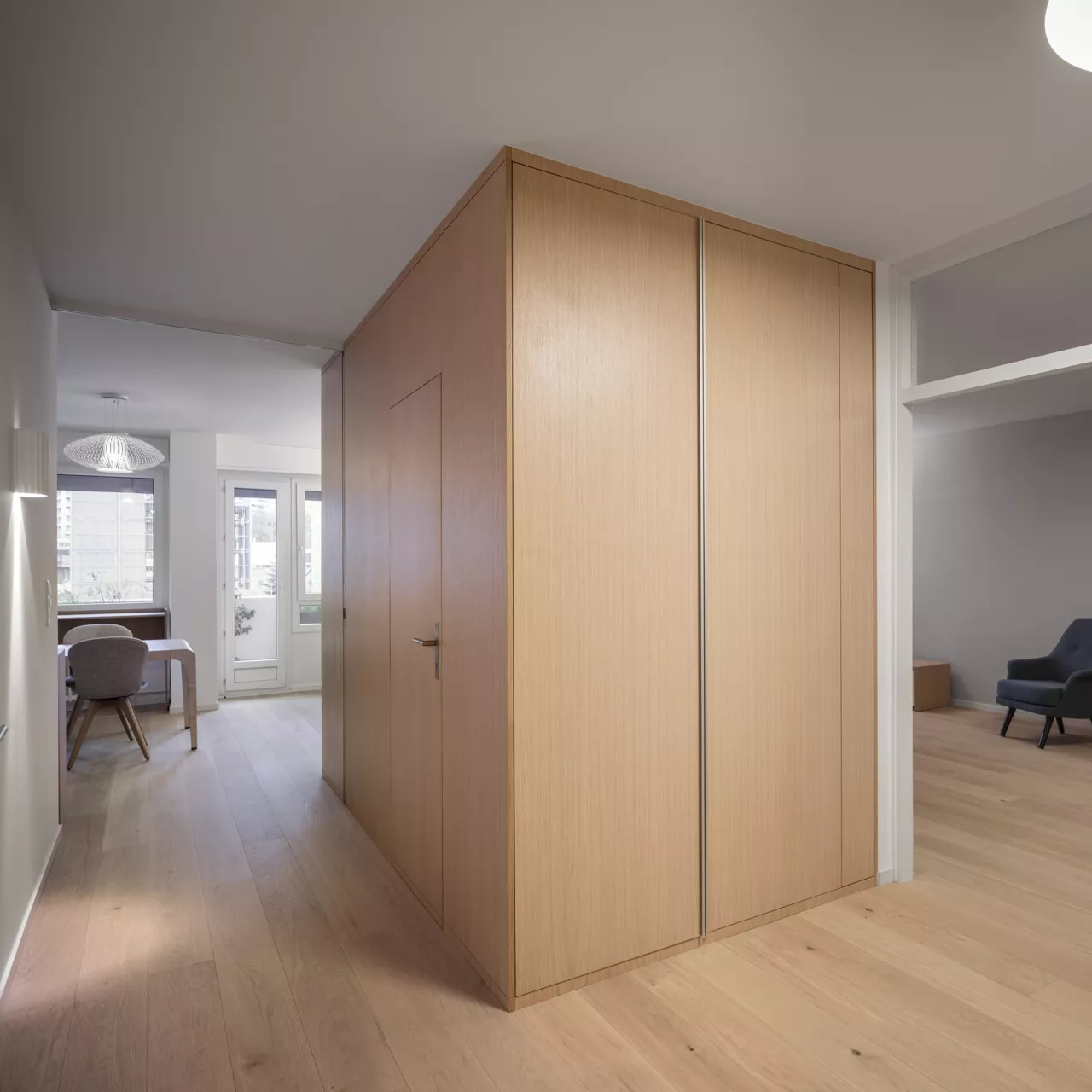 Transformation d’un appartement de 5 pièces avec une intervention particulière à l’entrée avec la réalisation d’un monolithe qui intègre la buanderie et le toilette visiteur. La paroi coulissante de la même matière délimite ou non l’espace de la nouvelle cuisine.