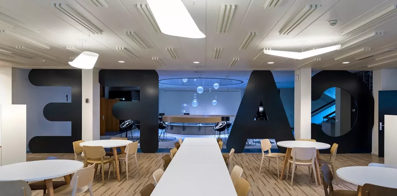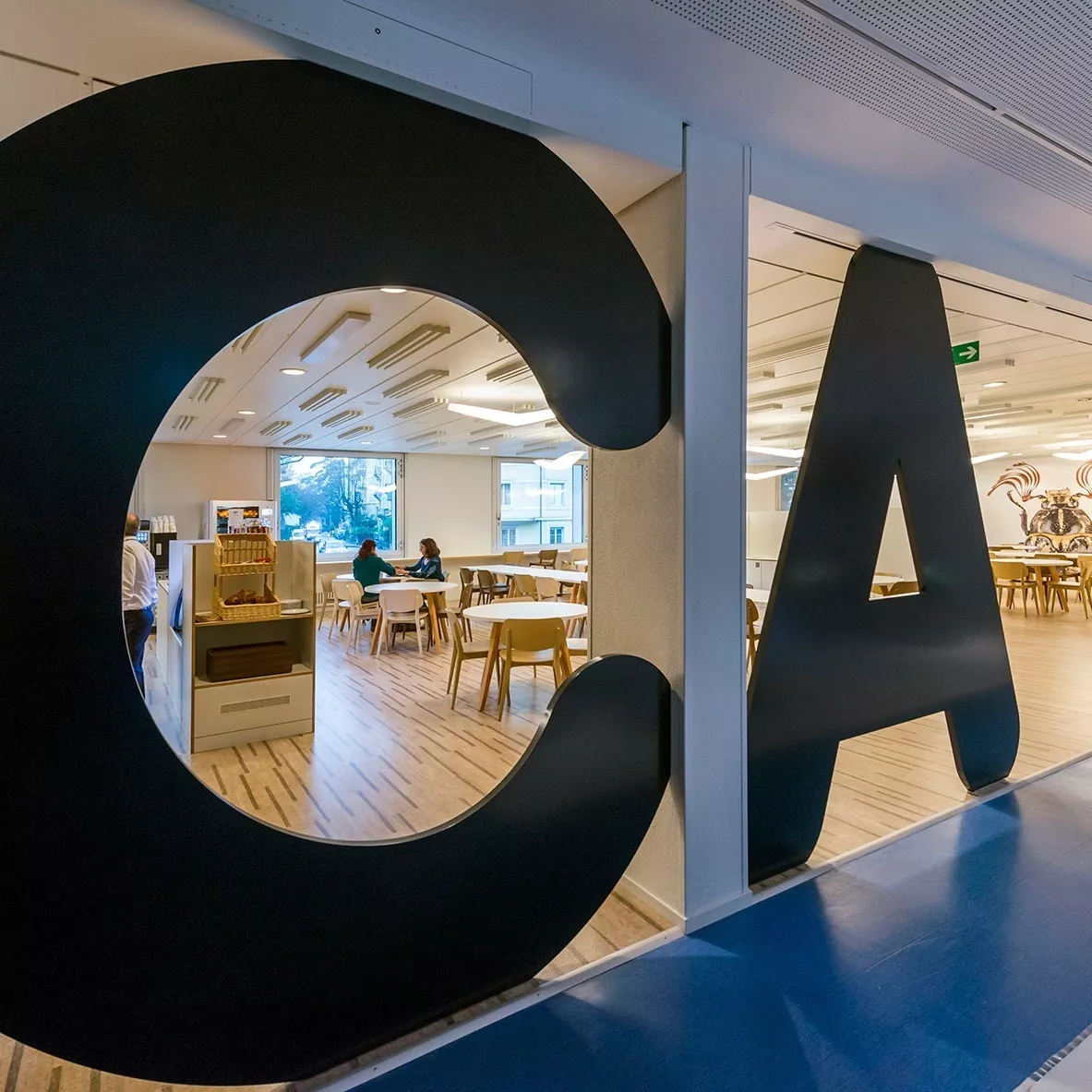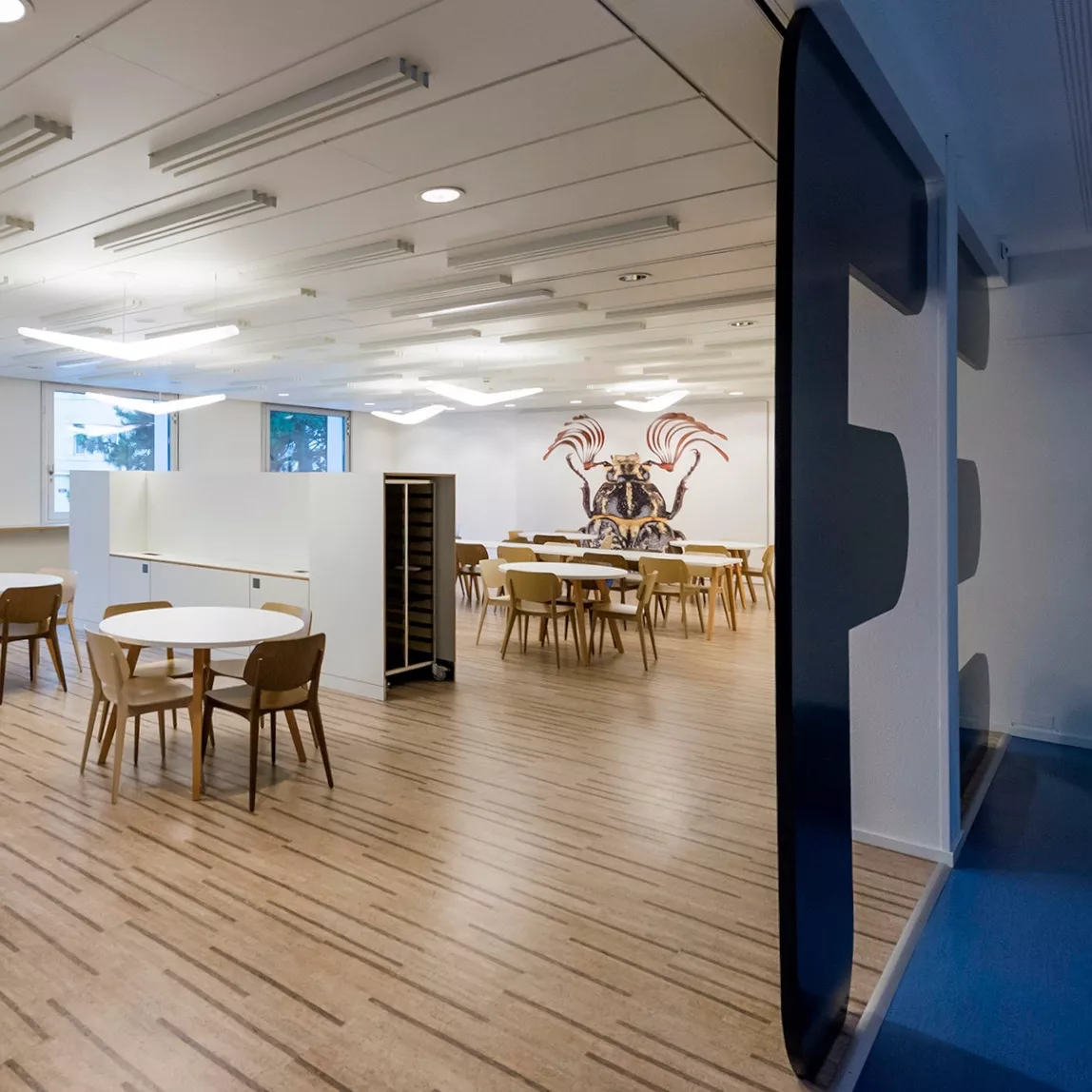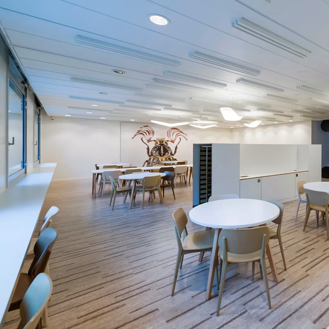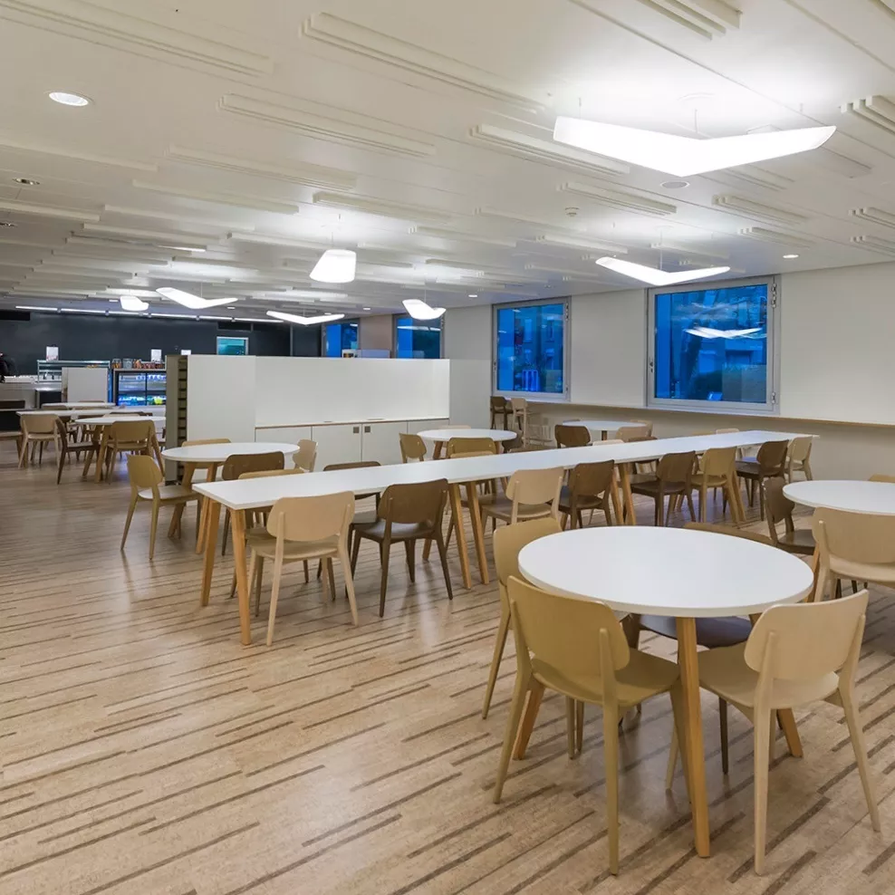 Transformation de la cafétéria, avec le maintien des techniques existantes, soit le plafond et le self.